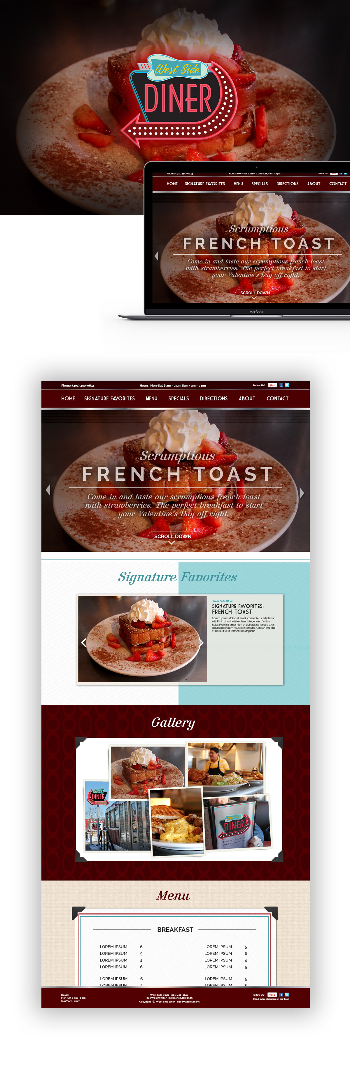 While working at Artinium, I was tasked with designing a vintage diner website. I tried to use a lot of vintage textures and looks in the design. The website was designed in Photoshop and programmed using Adobe Muse.